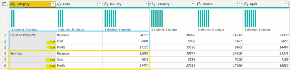 You will see in each of categories include revenue, cost, and profit by month in separated rows and they are included the missing values.