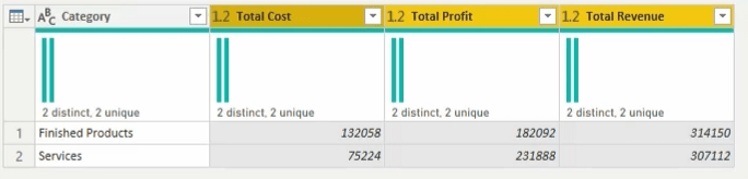 Here is the result, revenue, cost and profit are separated by categories and month.