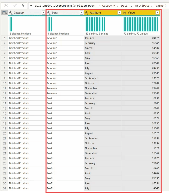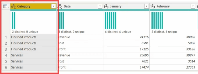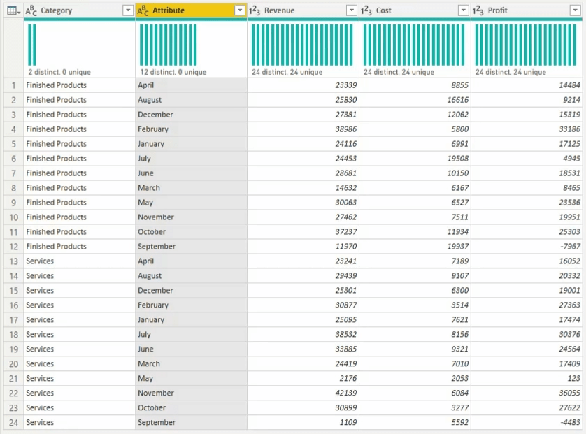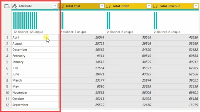 Here is the example dataset which represent business categorization , revenue, cost, and profit and subsequent column contains data for each month, but those data isn’t efficient to analyst data.