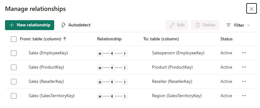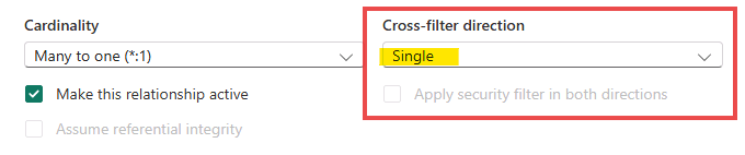 💡 Cross Filter Direction type is Single. Single filter direction means that filters propagate from the “one side” to the “many side”