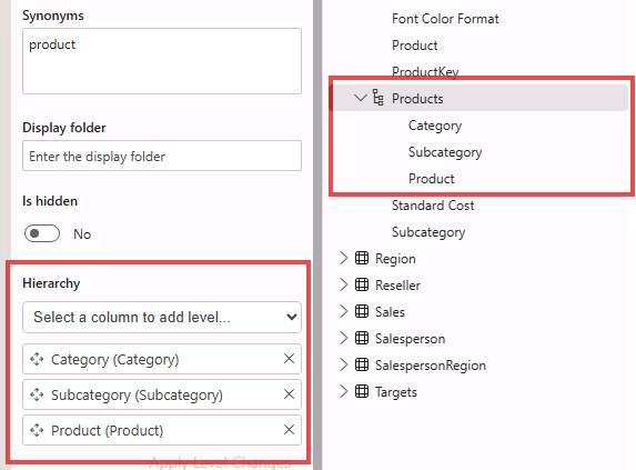 Adding levels to the hierarchy, in the Hierarchy dropdown list,