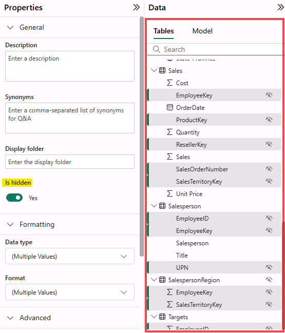 📖 To keeps them available for back-end logic (relationships, measures) in Model view but prevents them from cluttering the front-end