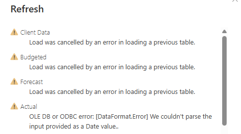 The error “OLE DB or ODBC error: [DataFormat.Error] We couldn't parse the input provided as a Date value” means